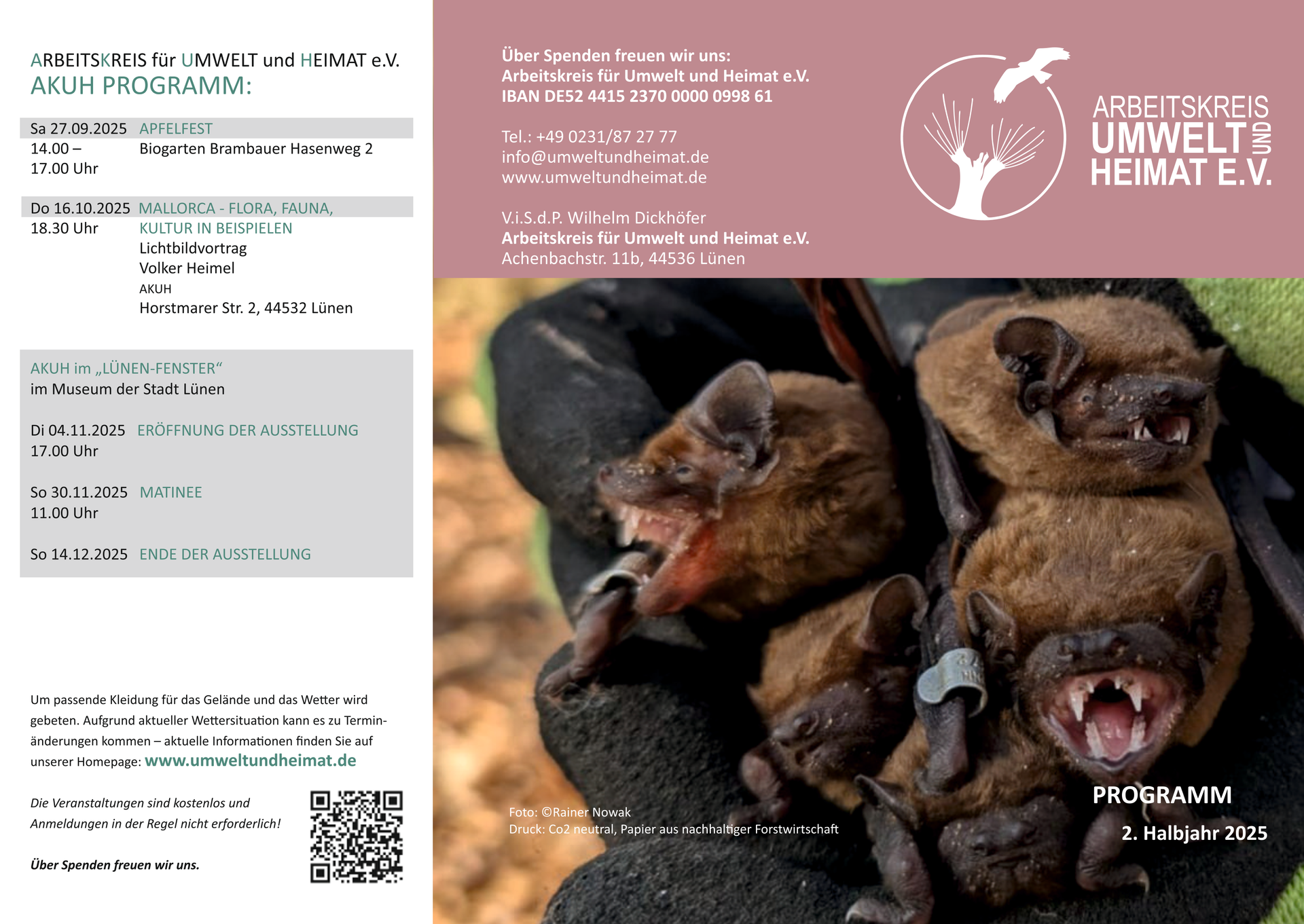 Der Arbeitskreis für Umwelt und Heimat e.V. hat seine Vortragsreihe zu Themen des Umwelt- und Naturschutzes für das erste Halbjahr 2025 zusammengestellt.