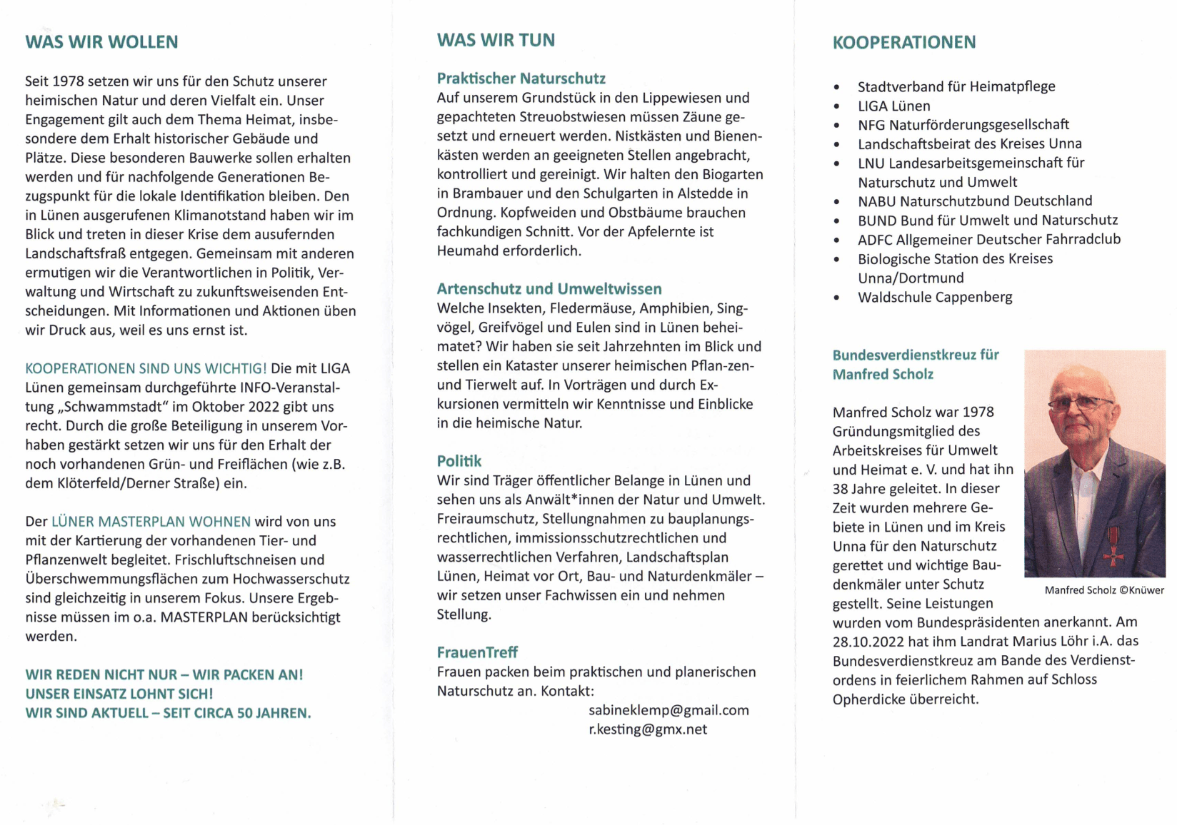 1978 gründete sich der Arbeitskreis als gemeinnütziger Verein und Manfred Scholz leitete ihn bis 2016. Dabei setzte er sich vor allem für die Erhaltung von Lünens Natur, den Schutz der Artenvielfalt und des Klimas ein. Jahrelang forderte er den Schutz der Lippeaue, bis sie europäisches FFH-Schutzgebiet (Fauna-Flora-Habitat Richtlinie) wurde. 2003 mobilisierte er den Arbeitskreis zur Unterstützung des Bürgerbegehrens „Stoppt den Landschaftsfraß“. Durch den Erfolg der Kampagne konnten die Gebiete Welschenkamp, Brechtener Niederung und Mühlenbachtal vor einer Überbauung als Gewerbegebiete gerettet werden, der Welschenkamp wurde sogar Naturschutzgebiet.