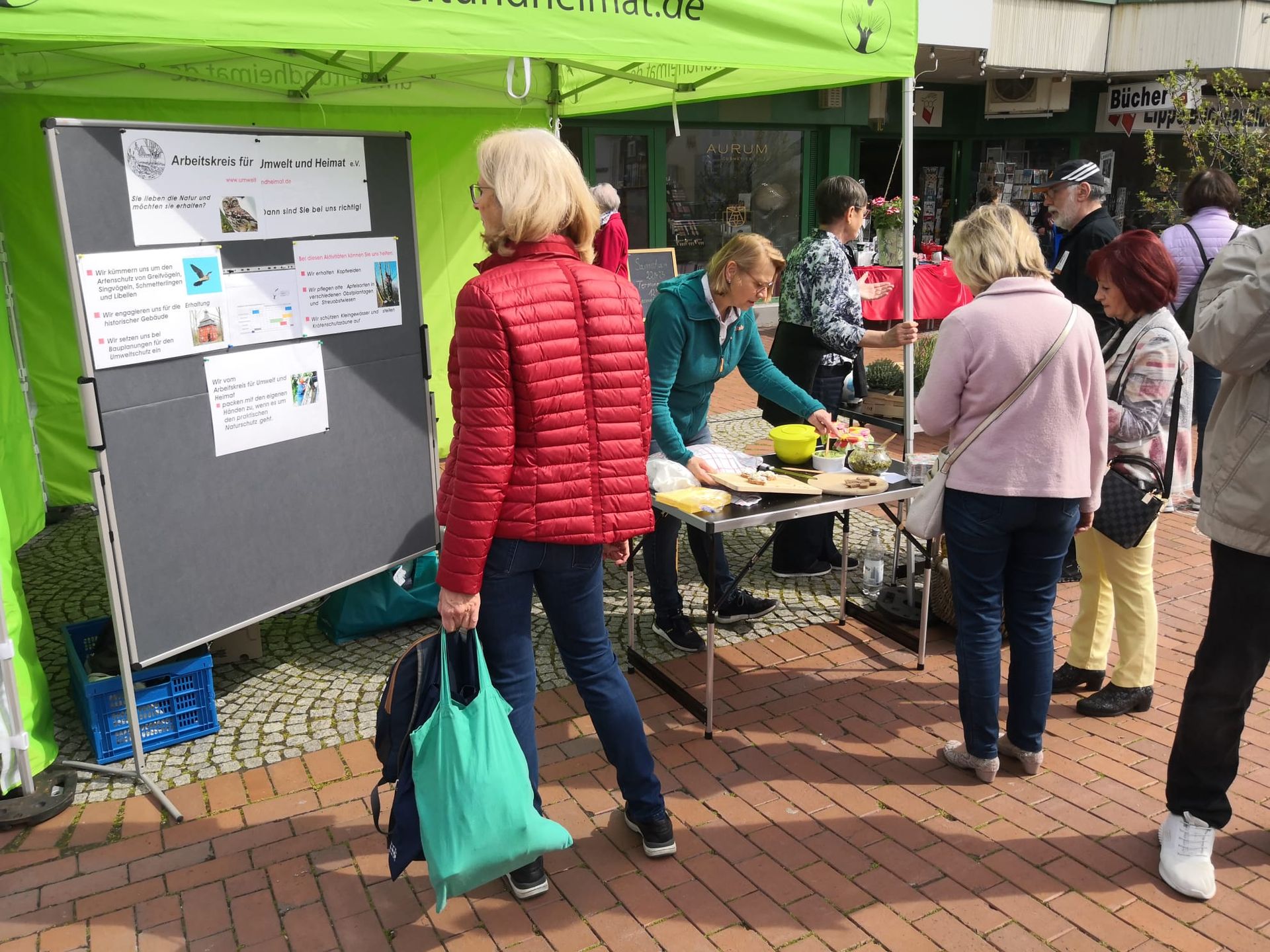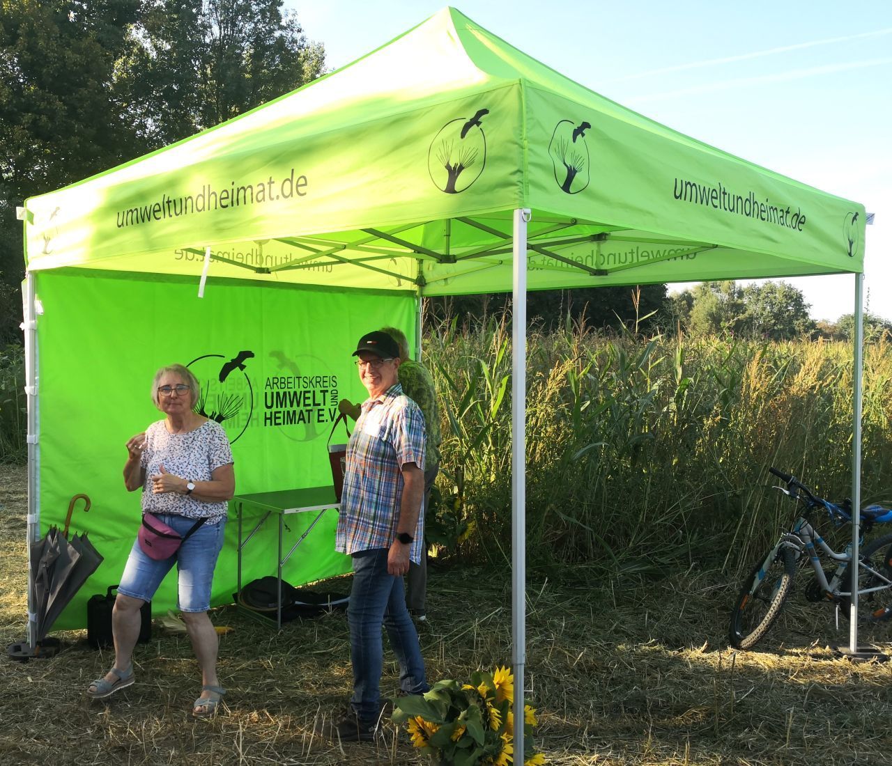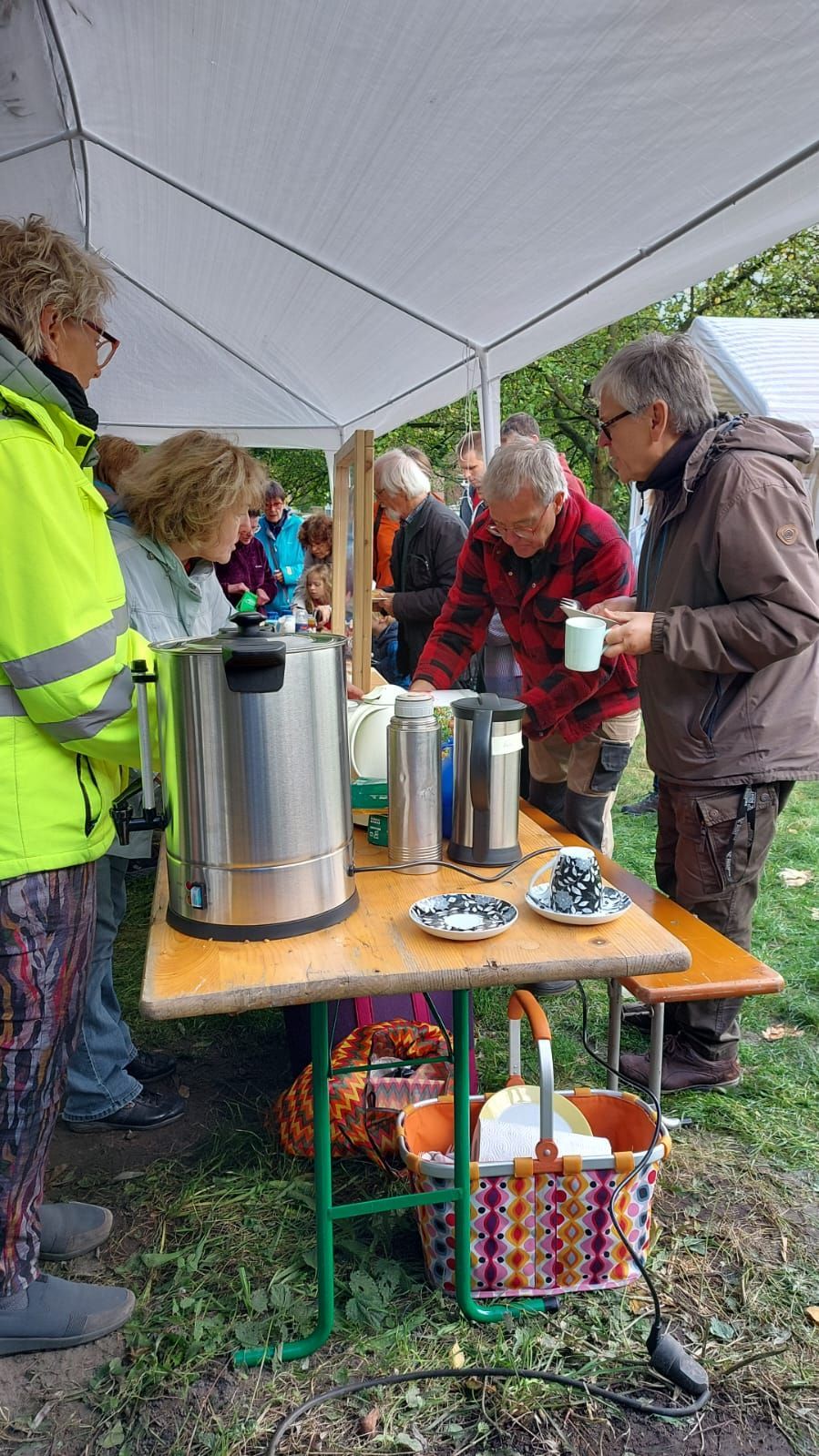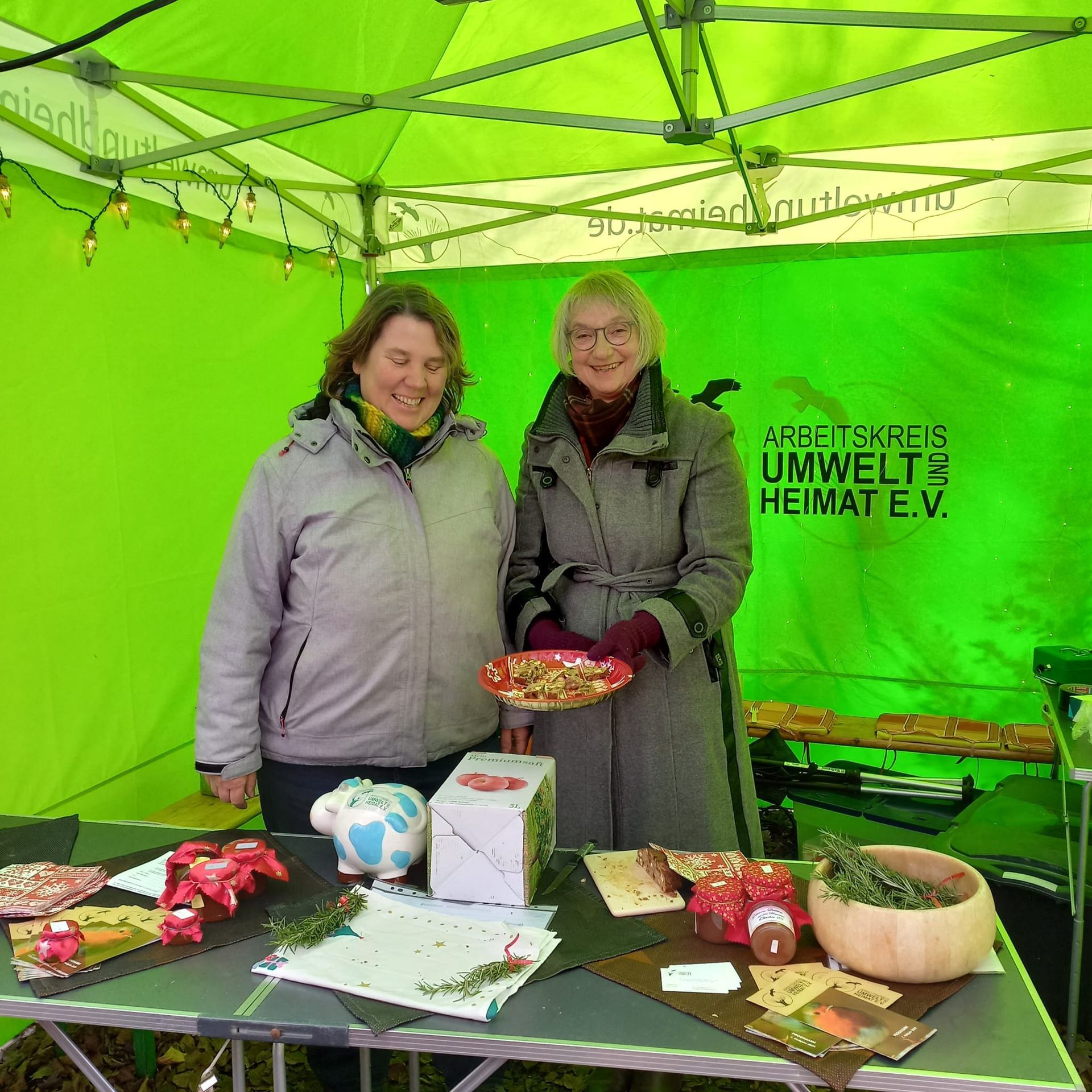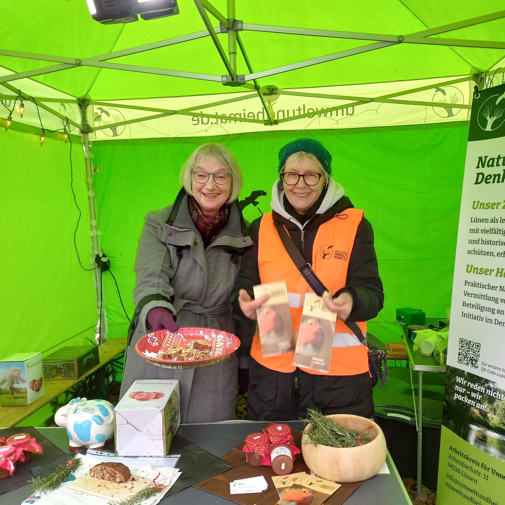 Schon von Weitem leuchtete der grüne Pavillon unseres Arbeitskreises am Anfang des Rundweges. Die Vorbeiziehenden waren allesamt gut gelaunt, sogar als sie bei strömendem Regen zum Nikolaus auf den Hauptplatz wollten. Viele nahmen sich Zeit für unsere Erklärungen zu den Zielen des Arbeitskreises, zugegebenermaßen angelockt durch kleine Proben vom Apfelbrot und Apfelsaft. Und viele nahmen sich unseren Flyer zum 1. Halbjahr 2024 und einen kleinen Zweig Rosmarin mit weihnachtlicher Schleife mit auf den Heimweg. Die Standbesatzung hat in den drei Tagen alles gegeben. Besonders ist hervorzuheben, dass drei neu in den Verein eingetretene Damen sofort bereit waren, dick eingemummelt ihren Charme für unsere Sache zu versprühen.