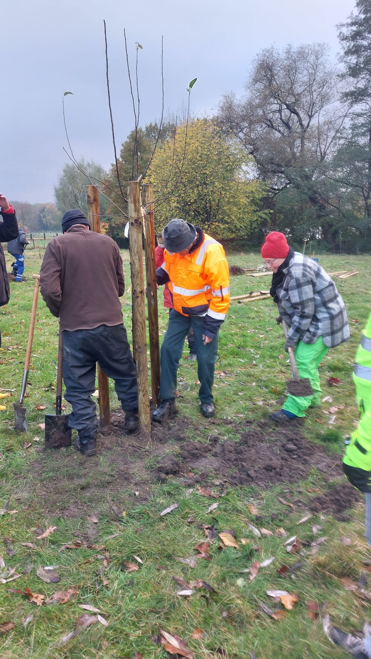 Normalerweise werden die Bäume nach der Pflanzung gewässert. Da aber das Grundwasser bereits nach dem Ausheben der Pflanzlöcher zum Vorschein kam, verzichteten wir auf diese Maßnahme.