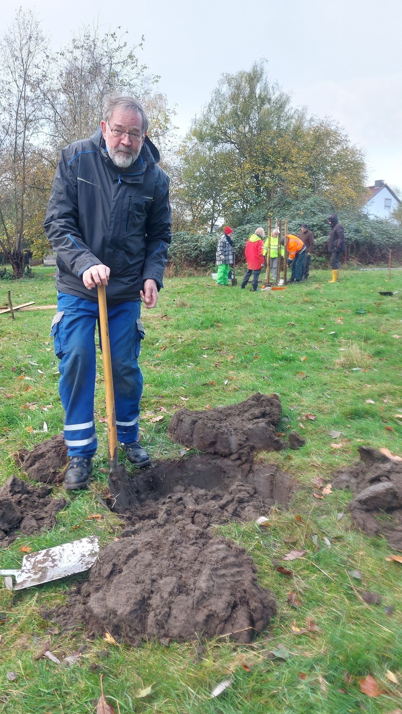 Am Samstag (11.11.) trafen sich zwölf hochmotivierte Arbeitskreismitglieder am Biogarten, um 10 Hochstamm-Obstbäume zu pflanzen. Die Arbeitseinweisung erfolgte durch Klaus Papius und beinhalte folgende Vorgehensweise: