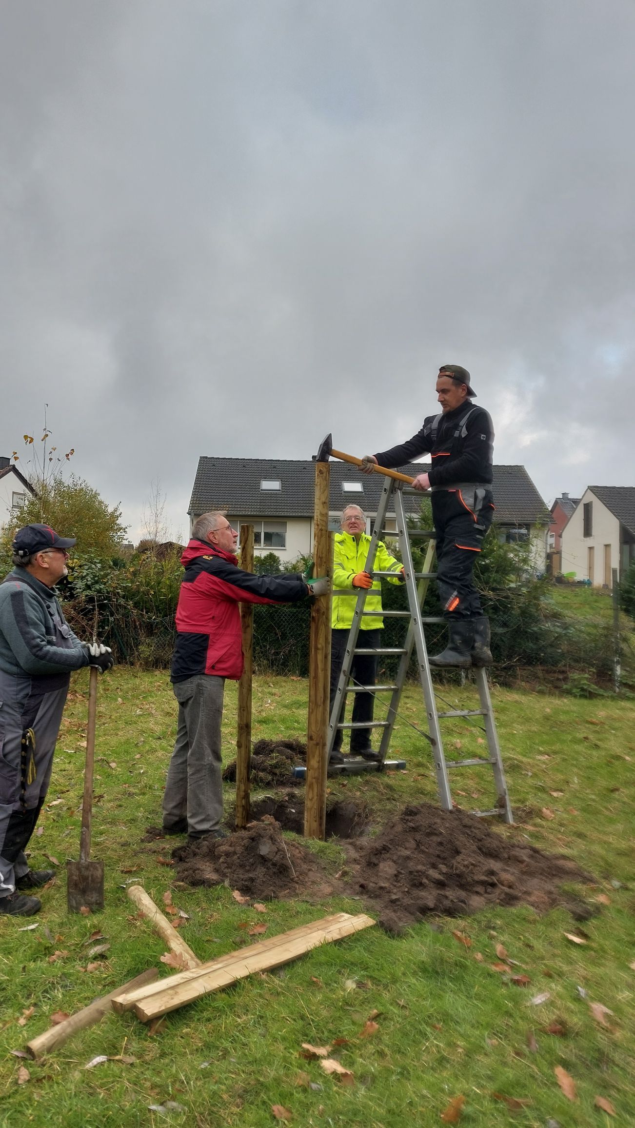 - Die Stützpfähle mit dem Vorschlaghammer im vorgegebenen Abstand einschlagen.