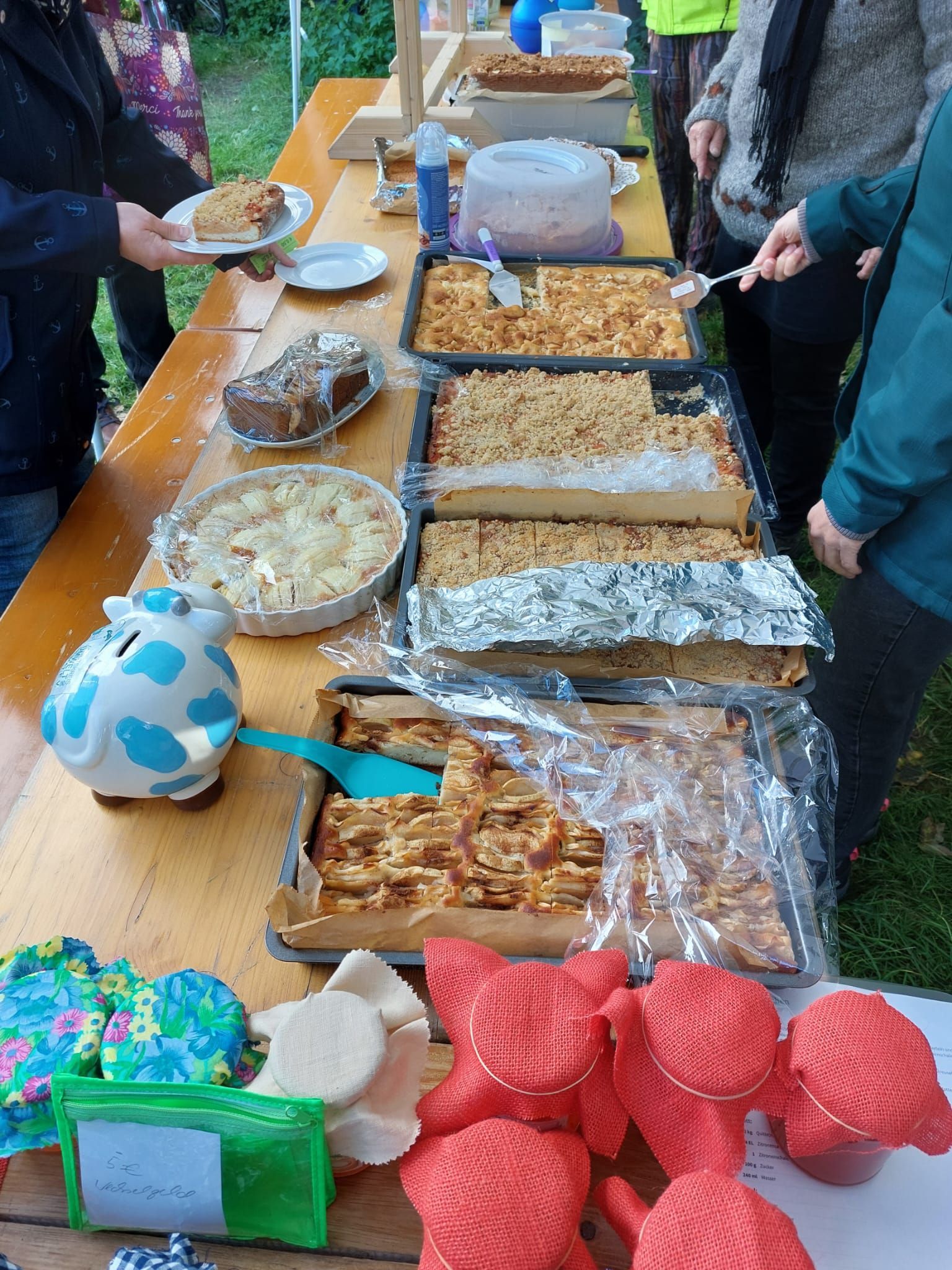 Mit einem Streifen Wertmarken in der Hand strebten sie dann zum Kuchenstand, um aus den vielen selbstgebackenen Köstlichkeiten auszuwählen. Die Frauen vom FrauenTreff hatten ca. 20 Apfelkuchen gebacken. Apfel- und Quittengelee wurde auch angeboten.