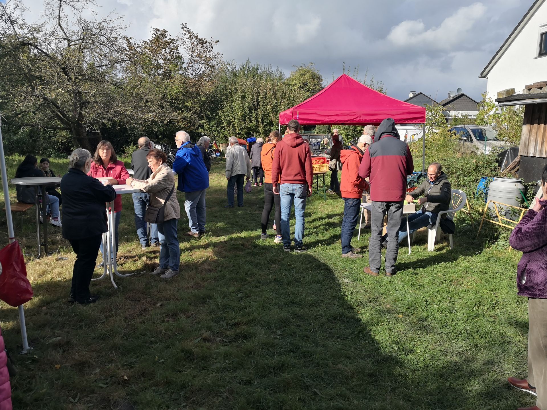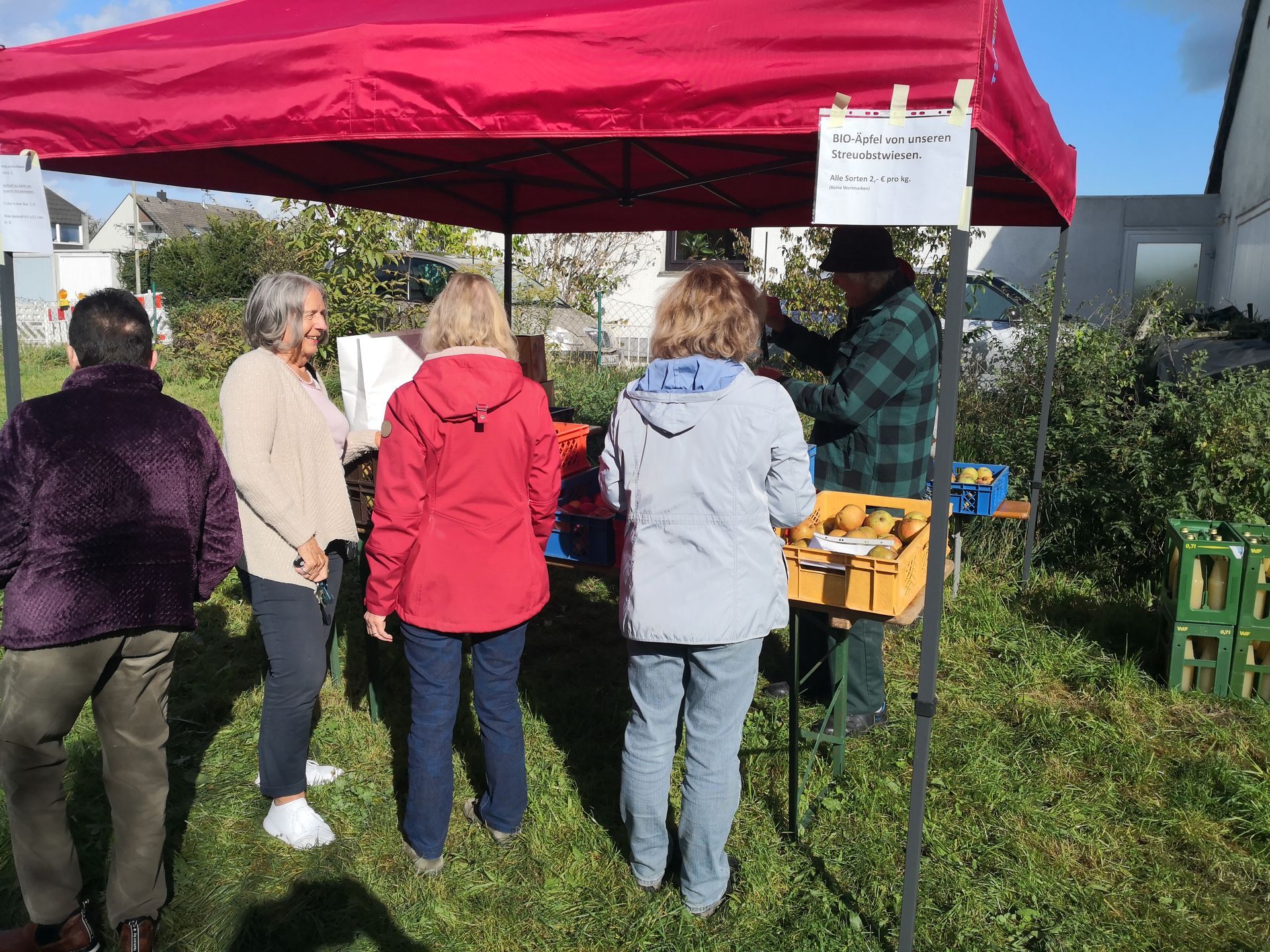 Die Streuobstwiesen des Arbeitskreises haben auch in diesem Jahr wieder genug geliefert, um zu Saft gepresst und zu Kuchen für den diesjährigen Apfeltag verarbeitet zu werden. Die Vorbereitungen für das Fest waren pünktlich um 14 Uhr von den ca. 20 aktiven Mitgliedern abgeschlossen, als die ersten Besucher durch das Tor zum Biogarten kamen. Es wurden über 100 Gäste im Laufe der nächsten 3 Stunden, die sich am Apfelverkaufsstand von Klaus Papius über die Apfelsorten wie Rheinischer Krummstiel, Danziger Kantapfel, Gravensteiner und Boskoop informieren ließen. Den Saft gab es in Flaschen und in 5 l Kanistern zu kaufen.