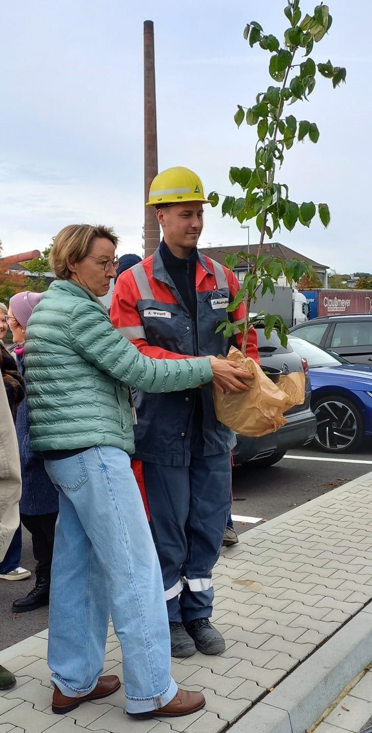Erste Station war der neue Mitarbeitendenparkplatz von Aurubis als ein Beispiel für versiegelte Flächen, d.h. das Regenwasser läuft hier ungehindert in die Kanalisation. Der Bauantrag wurde im April 2022 gestellt, und damals galt bereits die Verordnung, dass gewerbliche Parkplätze ab 30 Stellplätzen mit einer Photovoltaikanlage ausgestattet werden müssen. Wie Dr. Aaron Weigelt, Leiter Umwelt, Energie und Nachhaltigkeit von der Aurubis AG in Lünen erklärte, seien die weiteren Planungen der Firma zur Verbesserung der Situation in Bezug auf den Parkplatz noch nicht abgeschlossen. Geprüft werde derzeit auch, ob das Regenwasser für die firmeneigene Brauchwasseraufbereitung verwendet und wann eine Photovoltaikanlage installiert werden kann. Die für eine PV- Anlage benötigten Leerrohre wurden beim Bau bereits gelegt. Im Anschluß an des Informationsgespräch wurde Dr. Weigelt von Gisela Weiss (LIGA) ein kleiner Baum überreicht.