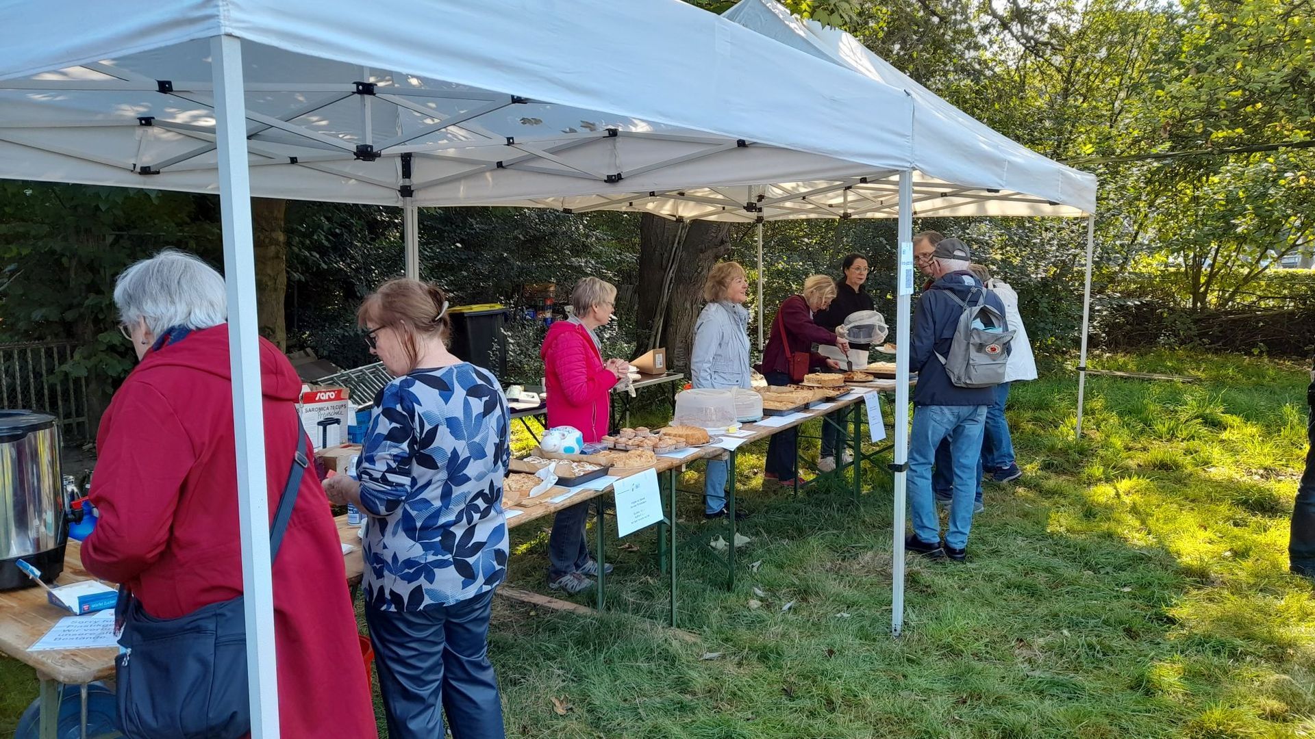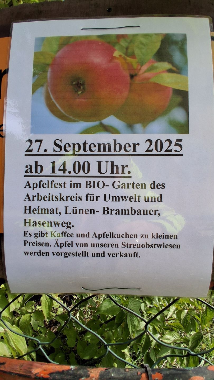 Pünktlich um 14:00 Uhr öffnete sich am Samstag (27.09.25) das Tor zum Biogarten am Hasenweg in Brambauer. Der Arbeitskreis für Umwelt und Heimat hatte zum alljährlichen und beliebten Apfelfest eingeladen. Bei herbstlich sonnigem Wetter wurden den Besuchern Äpfel und Apfelsaft von den eigenen Streuobstwiesen, Honig aus der Region, Keramiktassen mit Vogelmotiven, Schmetterlingsbücher und natürlich selbst gebackene Apfelkuchen angeboten. Einige Gäste waren besonders vorbildlich und brachten ihre eigenen Tassen und Teller mit.