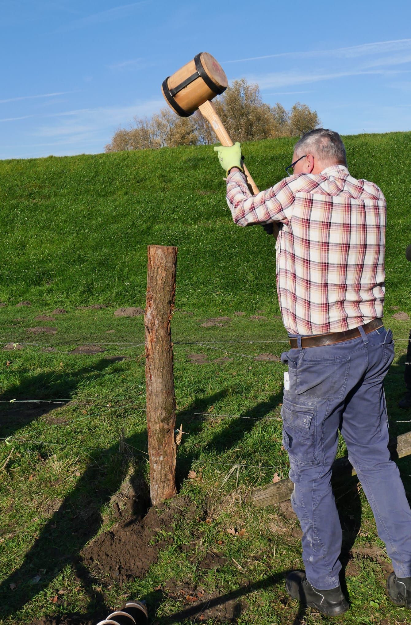 Am Freitag, den 07.11. wurde es etwas lauter in der Lippeaue. AK-Mitglieder hatten sich verabredet, um den alten Zaun auf unserem Grundstück teilweise zu erneuern. Mit einem motorbetriebenen Erdbohrer wurden Löcher gebohrt und von Hand die Eichenpfähle in die Erde geschlagen. Am Lippeufer war es teilweise sehr beschwerlich die Zaunpfähle zu setzen, insbesondere wenn noch eine vorgelagerte "Insel" mit abgesichert werden musste.