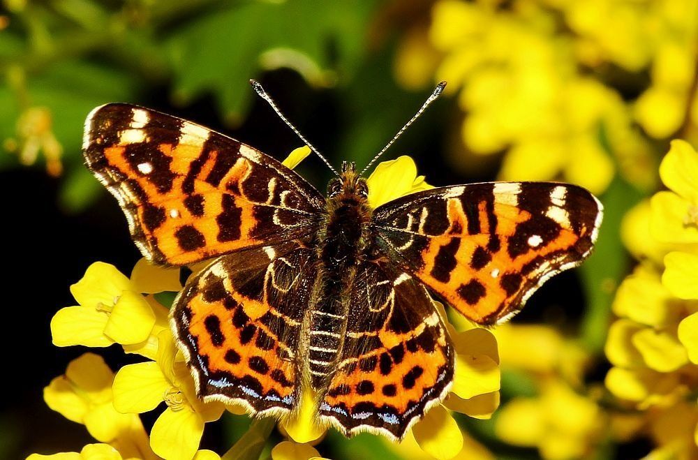 Das Landkärtchen (Spannweite 28-40 mm) kommt bei uns in zwei jährlichen Generationen vor. Falter der ersten Generation (April bis Juni) sind orangefarben, die der zweiten Generation (Juli und August) scharz mit weißen Bändern und gelblichen Flecken. Beide Formen zeigen auf der Flügelunterseite das namensgebende "Landkarten-Muster".