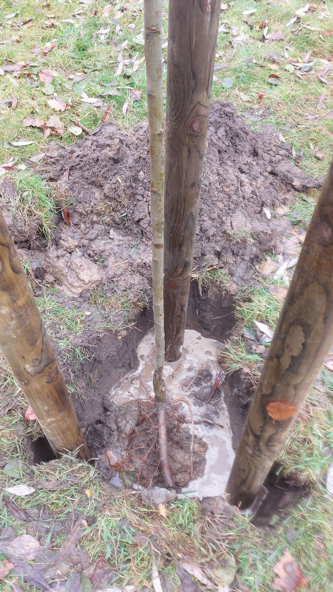 Normalerweise werden die Bäume nach der Pflanzung gewässert. Da aber das Grundwasser bereits nach dem Ausheben der Pflanzlöcher zum Vorschein kam, verzichteten wir auf diese Maßnahme.