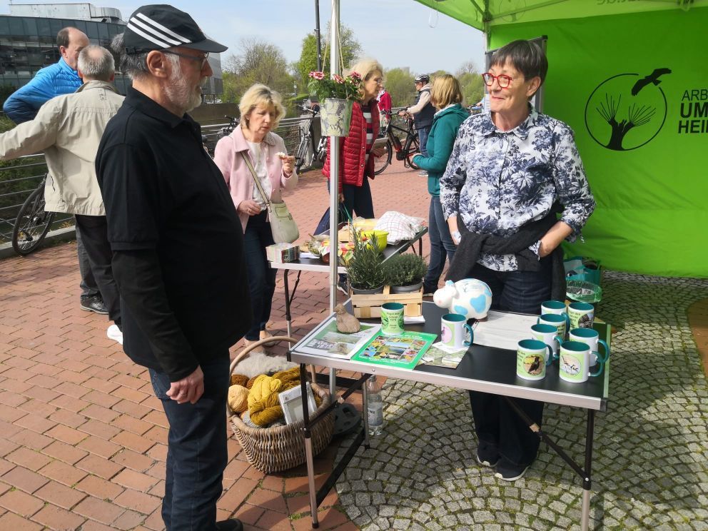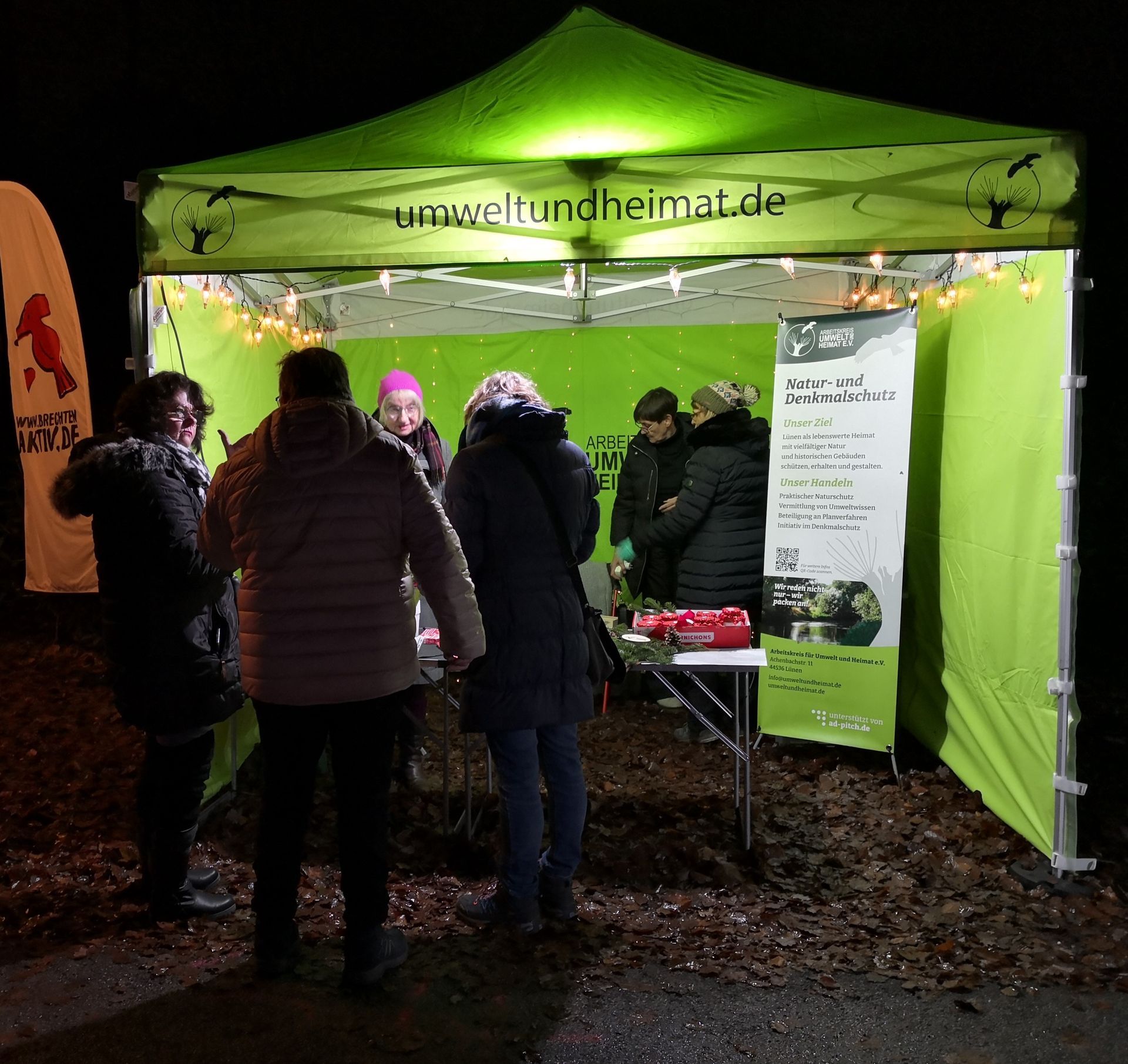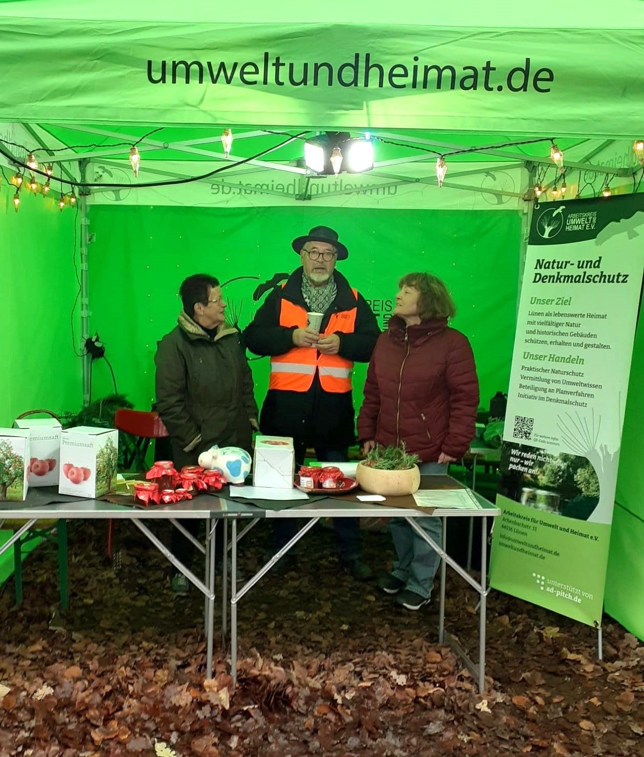 Schon von Weitem leuchtete der grüne Pavillon unseres Arbeitskreises am Anfang des Rundweges. Die Vorbeiziehenden waren allesamt gut gelaunt, sogar als sie bei strömendem Regen zum Nikolaus auf den Hauptplatz wollten. Viele nahmen sich Zeit für unsere Erklärungen zu den Zielen des Arbeitskreises, zugegebenermaßen angelockt durch kleine Proben vom Apfelbrot und Apfelsaft. Und viele nahmen sich unseren Flyer zum 1. Halbjahr 2024 und einen kleinen Zweig Rosmarin mit weihnachtlicher Schleife mit auf den Heimweg. Die Standbesatzung hat in den drei Tagen alles gegeben. Besonders ist hervorzuheben, dass drei neu in den Verein eingetretene Damen sofort bereit waren, dick eingemummelt ihren Charme für unsere Sache zu versprühen.