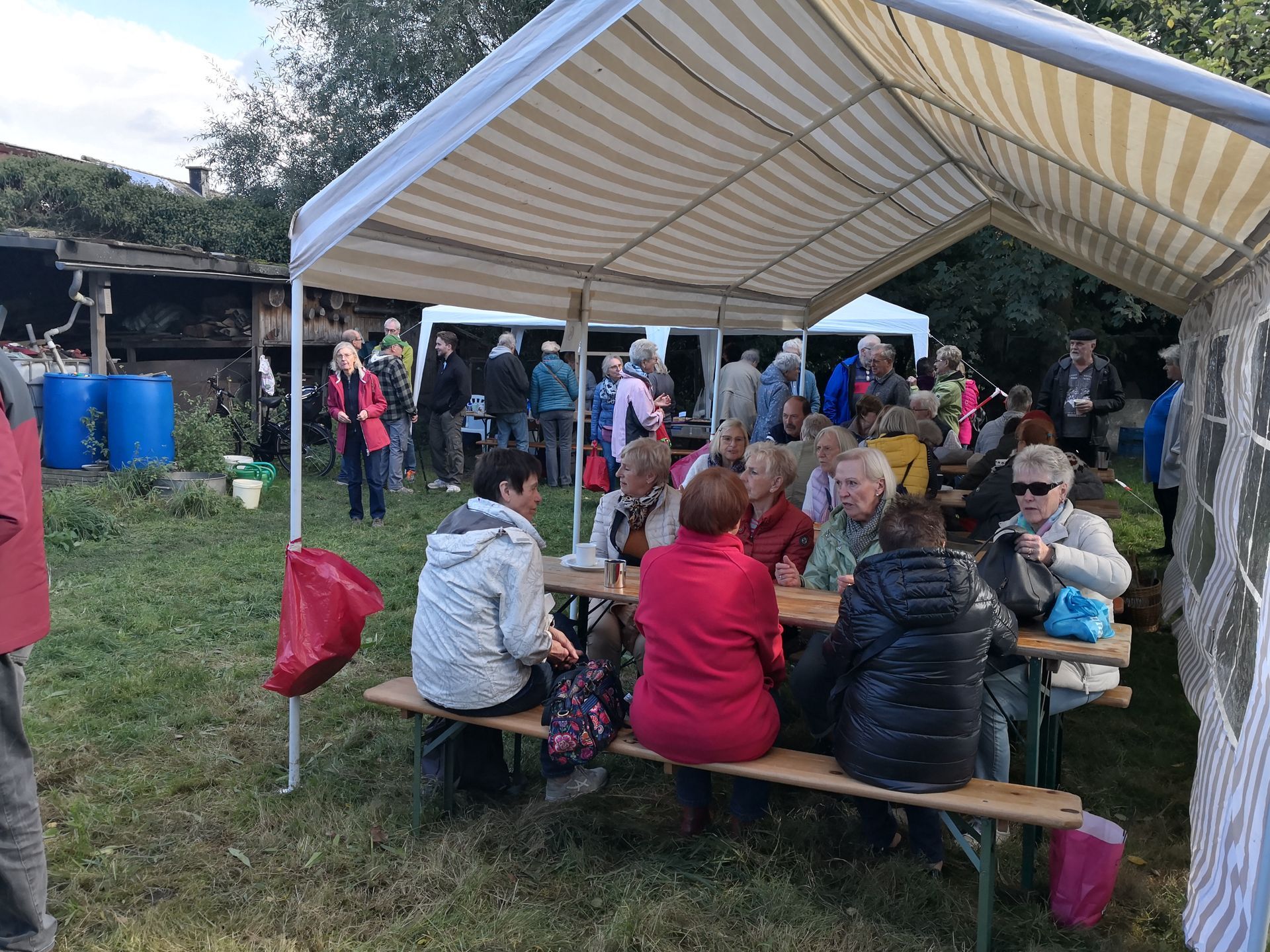 Die Streuobstwiesen des Arbeitskreises haben auch in diesem Jahr wieder genug geliefert, um zu Saft gepresst und zu Kuchen für den diesjährigen Apfeltag verarbeitet zu werden. Die Vorbereitungen für das Fest waren pünktlich um 14 Uhr von den ca. 20 aktiven Mitgliedern abgeschlossen, als die ersten Besucher durch das Tor zum Biogarten kamen. Es wurden über 100 Gäste im Laufe der nächsten 3 Stunden, die sich am Apfelverkaufsstand von Klaus Papius über die Apfelsorten wie Rheinischer Krummstiel, Danziger Kantapfel, Gravensteiner und Boskoop informieren ließen. Den Saft gab es in Flaschen und in 5 l Kanistern zu kaufen.