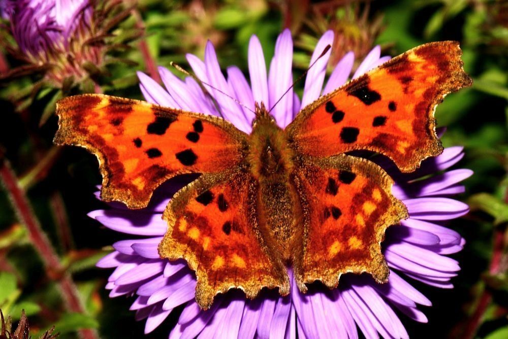 Der C-Falter (Spannweite 42-50 mm) fliegt in lichten Wäldern , Auen und auch in unseren Gärten. Auf der Oberseite ist die Grundfärbung der Flügel des C-Falters orange. Darauf befindet sich ein charakteristisches Muster aus gelblichen, braunen und schwarzen Flecken. Das namensgebende Merkmal dieser Tagfalterart ist auf der Unterseite der Hinterflügel zu finden: Dort tragen die Tiere ein weißes “C” auf bräunlichem bis graugelbem Grund.