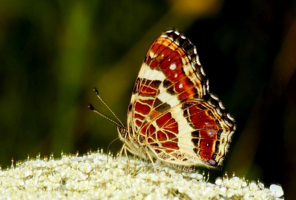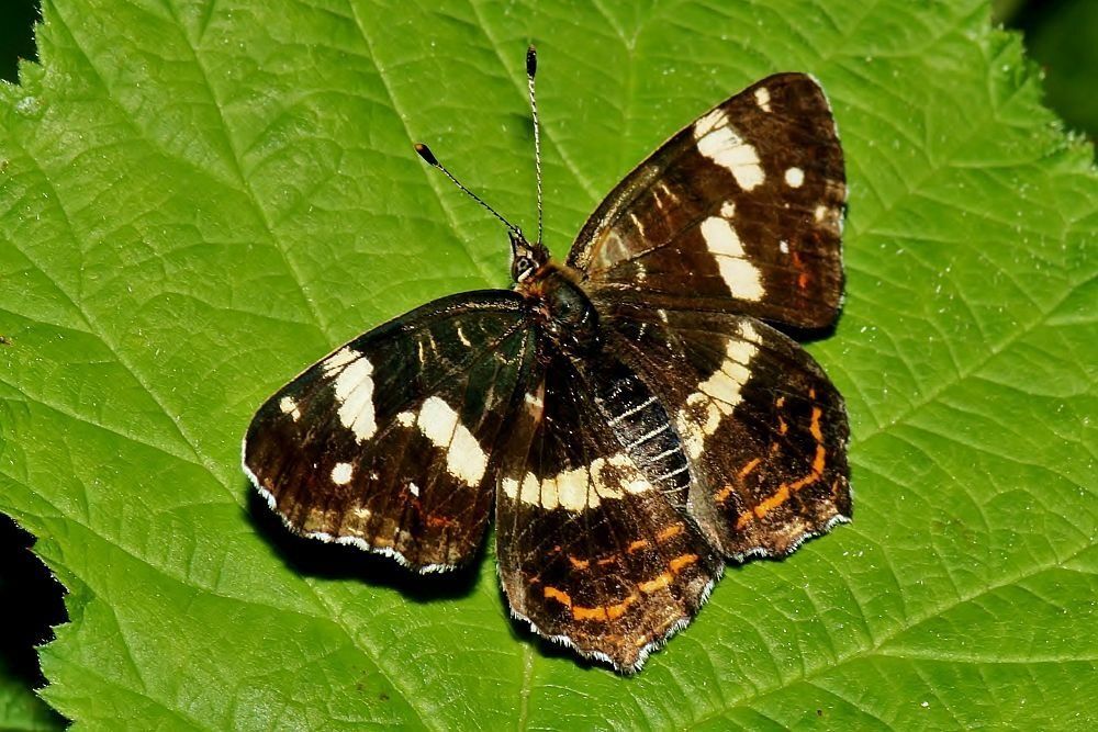 Das Landkärtchen (Spannweite 28-40 mm) kommt bei uns in zwei jährlichen Generationen vor. Falter der ersten Generation (April bis Juni) sind orangefarben, die der zweiten Generation (Juli und August) scharz mit weißen Bändern und gelblichen Flecken. Beide Formen zeigen auf der Flügelunterseite das namensgebende "Landkarten-Muster".