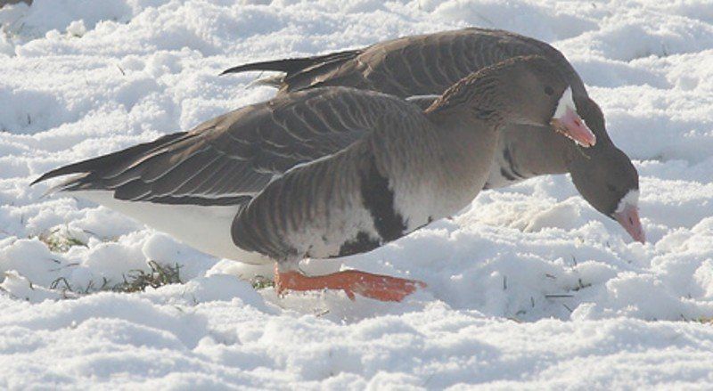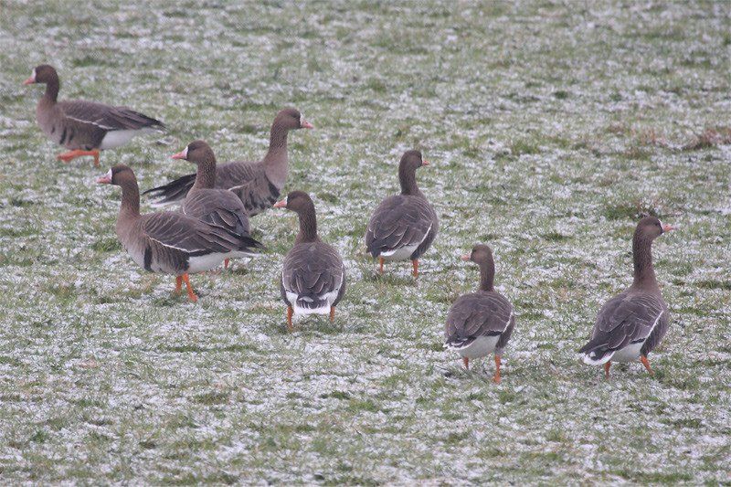 Blässgänse brüten in den arktischen Regionen Eurasiens und Amerikas, Saatgänse nur in Eurasien. Beide Arten überwintern regelmäßig auch in Mitteleuropa. Wichtige Überwinterungs-gebiete liegen z.B. in den Niederlanden und am Niederrhein. Im Lippetal waren diese Arten früher seltene Ausnahmeerscheinungen. Kleinere Gruppen legten hier höchstens einmal eine kurze Rast ein. Seitdem sich aber bei uns Graugänse und Kanadagänse angesiedelt haben und in größerer Zahl hier den Winter verbringen, landen immer öfter auch die arktischen Arten bei uns. Offensichtlich lassen sie sich von den Schwärmen dieser Arten anlocken. In den letzten beiden Wintern haben erstmalig Gruppen beider Arten hier den gesamten Winter verbracht. Auch wenn die Zahlen von höchstens bis zu 200 Tieren nicht vergleichbar sind mit den zig-Tausenden am Niederrhein, so zeichnet sich hier doch vielleicht die Entstehung einer neuen Überwinterungstradition ab. Bei den Saatgänsen handelt es sich um die Tundra-Saatgans. Die etwas südlicher brütende Taiga-Saatgans ist inzwischen eine große Rarität und erscheint regelmäßig nur noch in kleiner Zahl in Ostdeutschland.